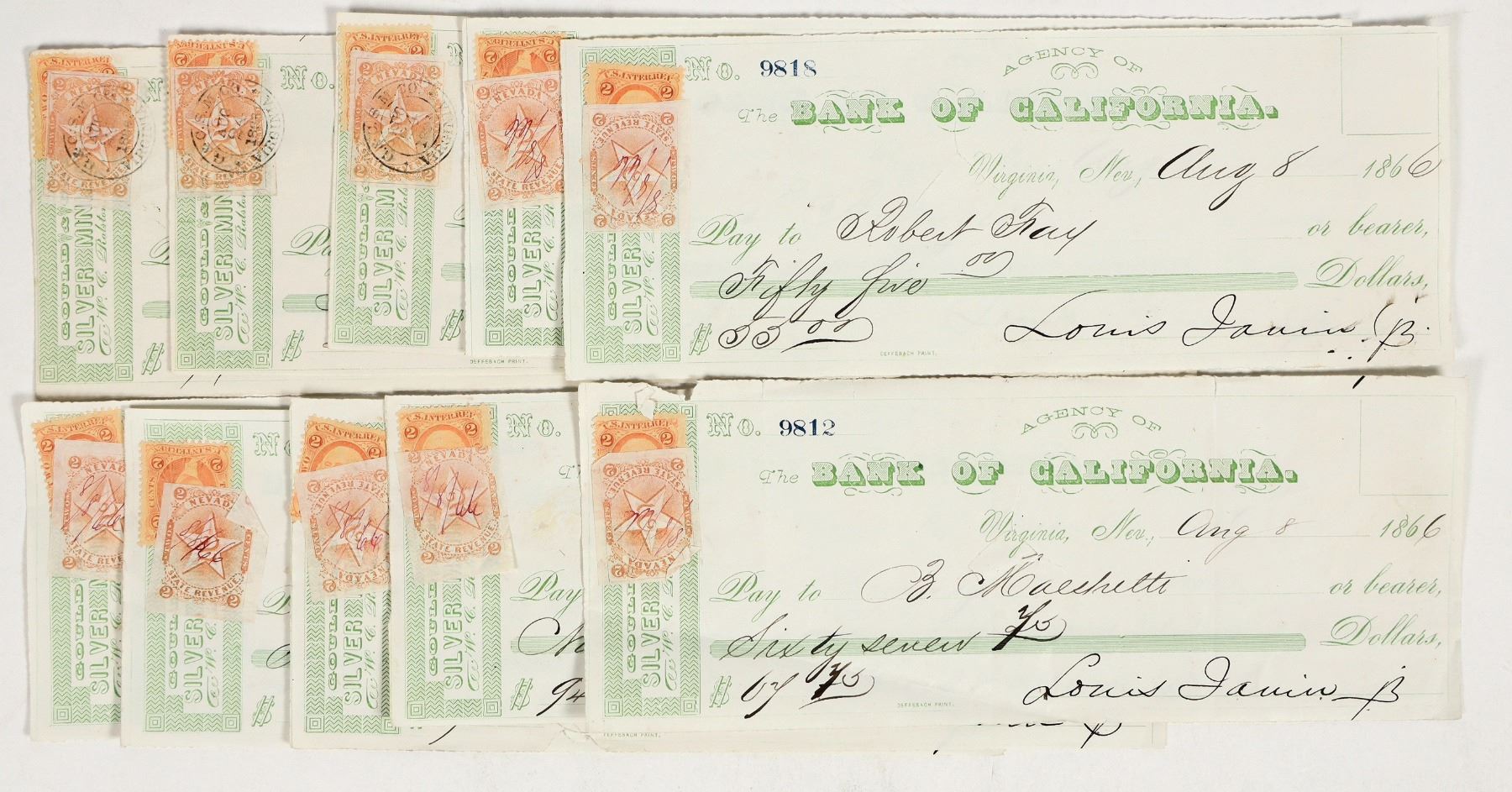 Lot of 10 checks issued in 1866 and signed by Louis Janin as superintendent. All have orange NV adhesive and US IR revenue stamps. Great resale lot! Louis Janin (1837–1914), a Yale-trained mining engineer educated at the Freiberg Mining Academy, gained prominence on the Comstock Lode in the early 1860s by recovering silver from discarded tailings and improving amalgamation techniques at the Gould & Curry's Mexican Mill. He later served as a global consulting engineer and expert witness in major mining litigation, advised the Japanese government in 1873, and mentored future industry leaders such as Herbert Hoover and John Hays Hammond. (see detailed bio here https://wchsutah.org/people/louis-janin1.pdf).