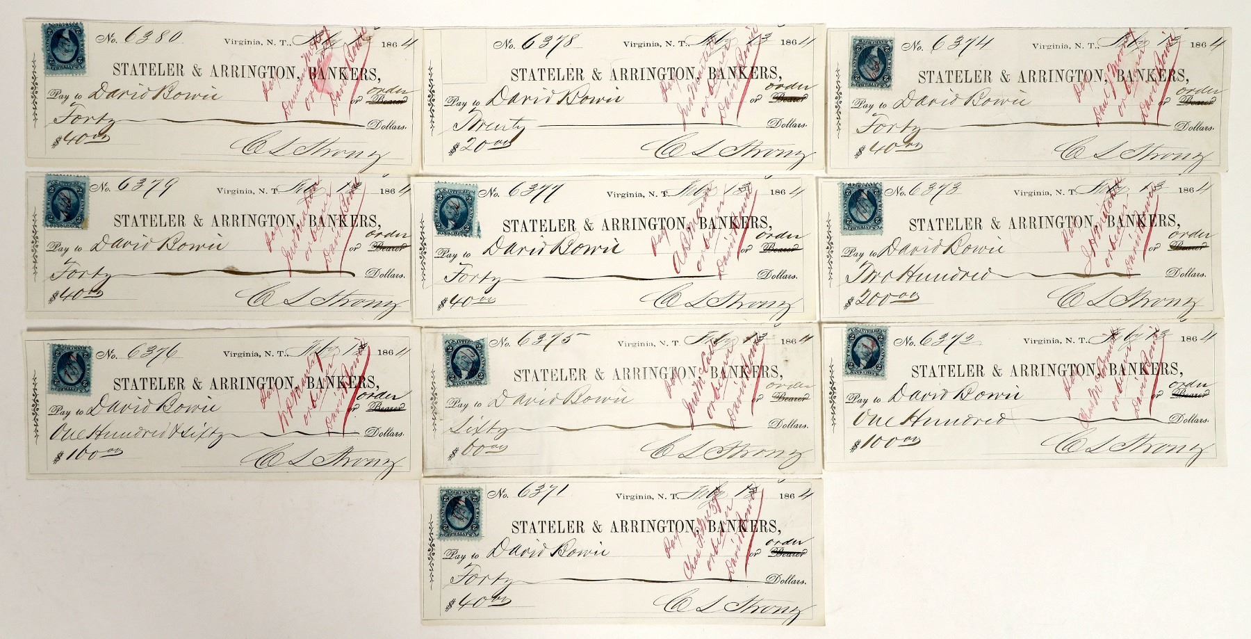 Lot of 10 consecutive checks issued to the company's book-keeper David Bowie who later became the superintendent. Stateler & Arrington, Gould & Curry Silver Mining Company. All signed by Charles Strong as supt., who would be replaced by Charles Bonner after his poor handling of the spectacularly expensive company mill. This is a unique chance to get consecutive checks.