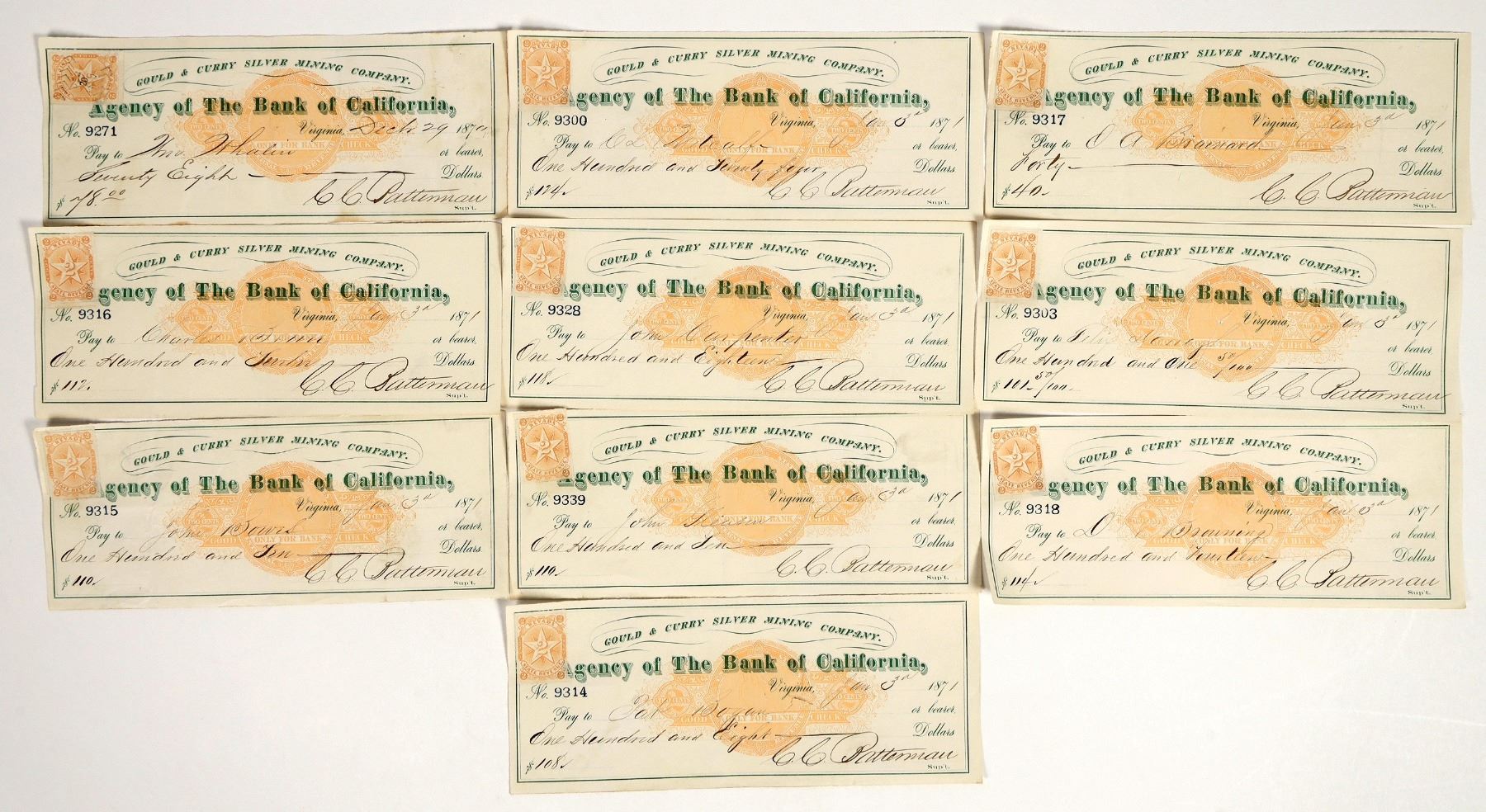 Lot of 10 Bank of California Gould & Curry Silver Mining Company checks issued 1870-71. All have RN-C imprinted revenue plus an orange Nevada adhesive revenue stamp. All signed by CC Batterman as superintendent. Batterman was also supt. for the Imperial Mine.