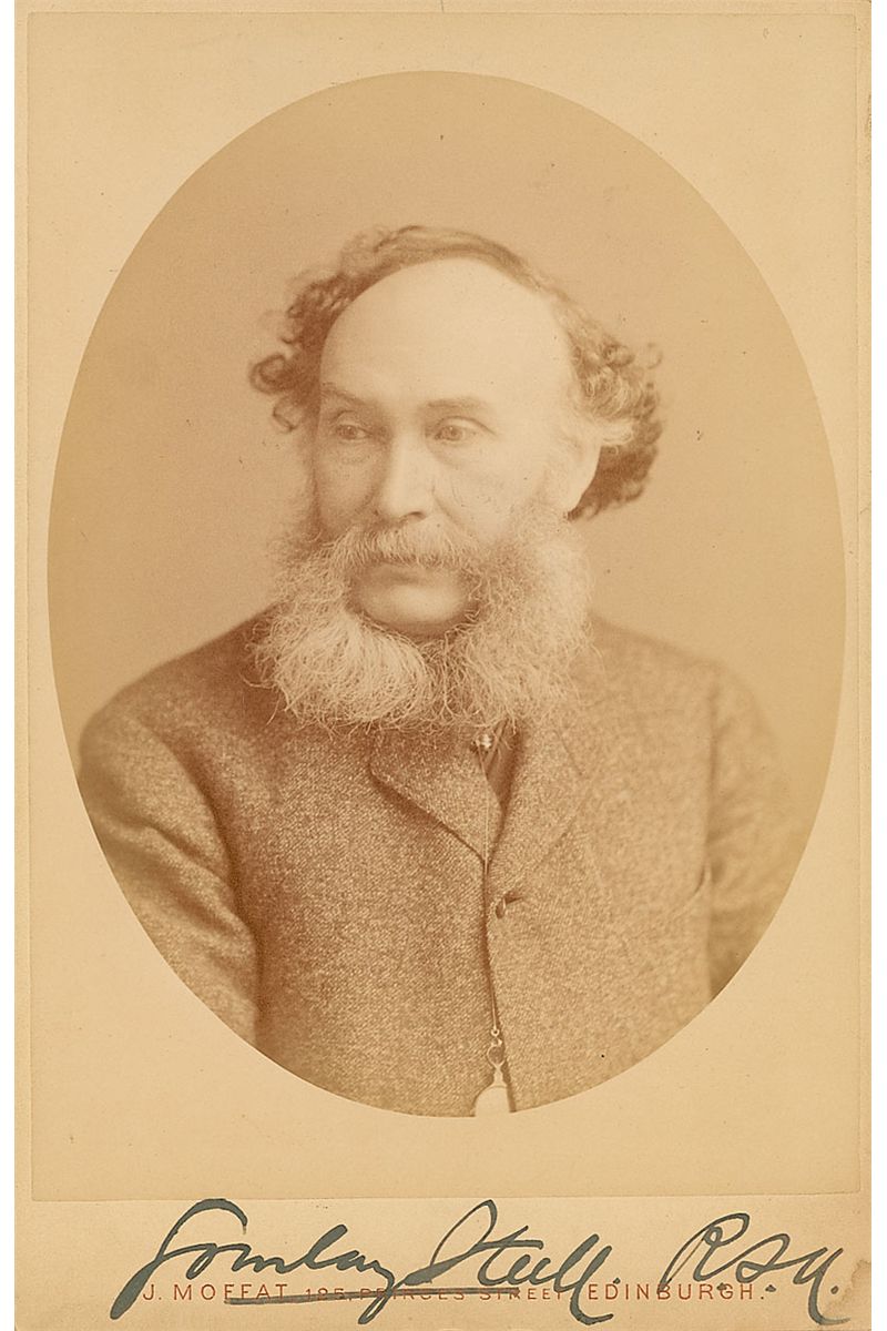 Animal painter (1819–1894) and member of the Royal Scottish Academy. Original 4.25 x 6.5 cabinet photo by J. Moffat of Edinburgh, signed in the lower border in black ink, “Gourlay Steell, R.S.A.” In fine condition, with slight damp staining to lower right corner.