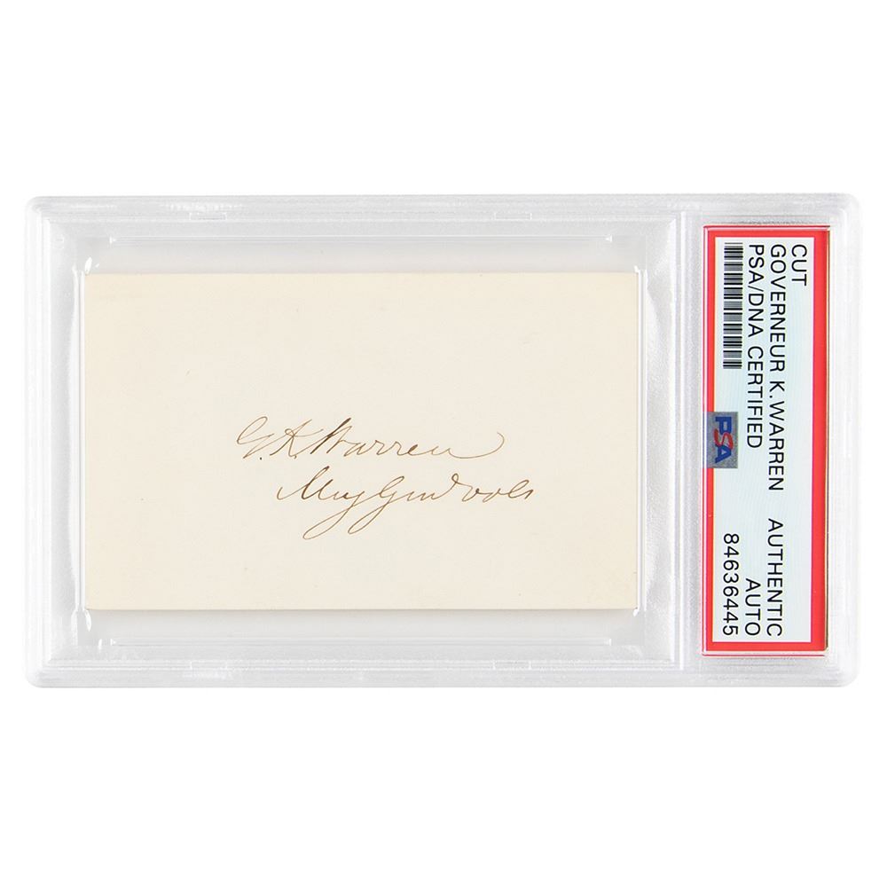 American military officer (1830-1882) who, despite earning the sobriquet & #39;Hero of Little Round Top& #39; for his actions at Gettysburg, was humiliated when General Philip Sheridan removed him from command after Warren& #39;s supposedly ineffective performance at Five Forks. Precise ink signature, "G. K. Warren, Maj. Gen. Vols.,& rdquo; on an off-white 3.5 x 2 card. In very fine condition. Encapsulated in a PSA/DNA authentication holder.