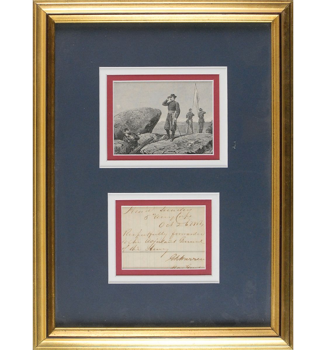 American military officer (1830–1882) who, despite earning the sobriquet ‘Hero of Little Round Top’ for his actions at Gettysburg, was humiliated when General Philip Sheridan removed him from command after Warren’s supposedly ineffective performance at Five Forks. War-dated endorsement, signed “G. K. Warren, Maj. Genl,” on an off-white lined slip, clipped from a larger document, dated October 26, 1863. Endorsement reads, “Respectfully forwarded to the Adjutant General of the Army,” and is signed underneath by Warren. Triple-matted and framed with a small portrait to an overall size of 10 x 13.5. In fine condition.