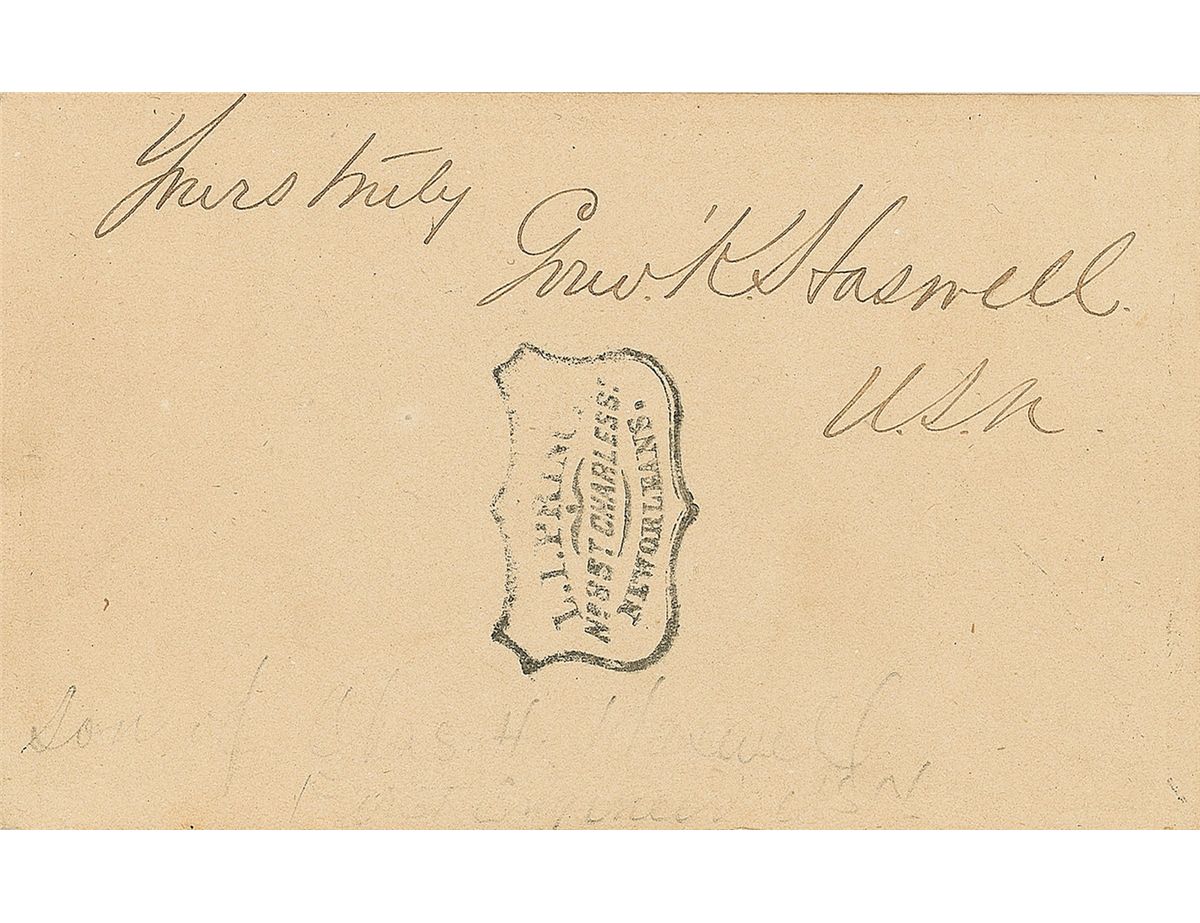 Union naval officer who served on board the Roanoke, Adirondack, and the Colorado. Original 2.25 x 4 full-length carte-de-visite photo of Haswell in civilian clothes by L. I. Prince of New Orleans, signed on the reverse in black ink, “Yours truly, Gov. K. Haswell, USN.” In fine condition.
