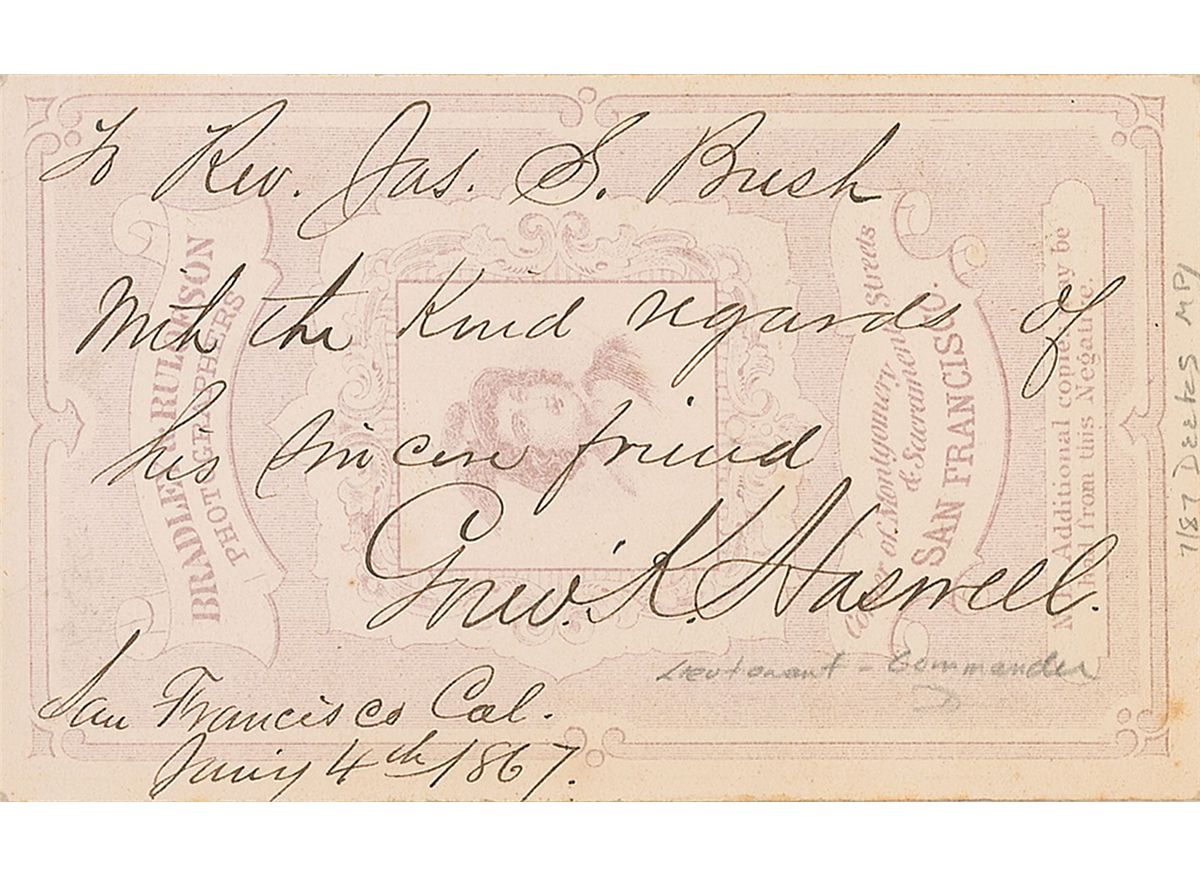 Original 2.25 x 4 carte-de-visite photo of Haswell in uniform by Bradley and Rulofson of San Francisco, signed and inscribed on the reverse in black ink “To Rev. Jas. S. Bush, with the kind regards of his sincere friend, Gov. K. Haswell, San Francisco, Cal, Jany 4th 1867.” In fine condition, with scattered light toning to image and a small pencil notation to reverse.