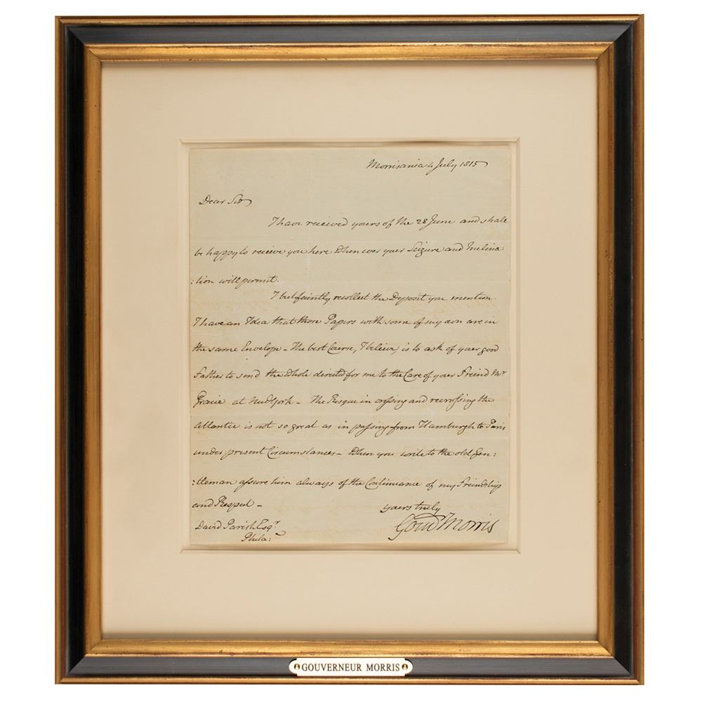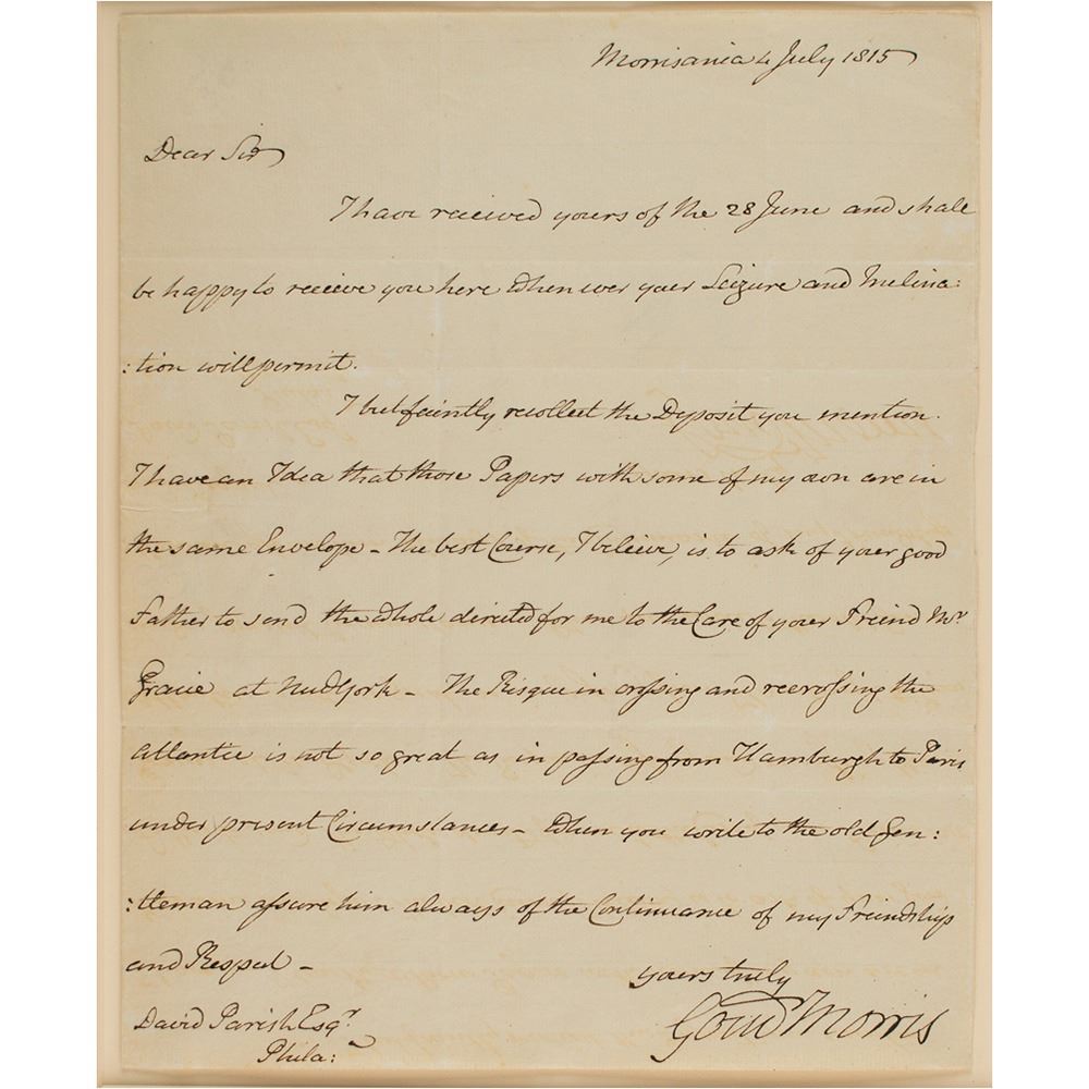 ALS signed “Gouv. Morris,†one page, 7.75 x 9.5, July 4, 1815. Addressed from Morrisania, a handwritten letter to David Parish of Philadelphia, in full: "I have received yours of the 28 June and shall be happy to receive you here whenever your Leisure and Inclination will permit. I but faintly recollect the Deposit you mention. I have an Idea that those Papers with some of my own are in the same Envelope. The best Course, I believe, is to ask of your good father to send the whole directed for me to the Care of your friend Mr. Gracie at New York. The Risque in crossing and recrossing the Atlantic is not so great as in passing from Hamburgh to Paris under present Circumstances. When you write to the old Gentleman assure him always of the Continuance of my friendship and Respect." Archivally mounted, matted, and framed to an overall size of 14.5 x 16.5. In fine condition.
