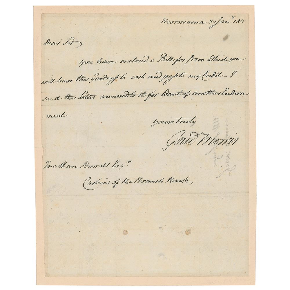 ALS signed ‰ÛÏGouv. Morris,‰Û one page, 7.5 x 9.5, January 30, 1811. Letter to Jonathan Barrall, the cashier of the Branch Bank, in full: "You have enclosed a Bill for $1200 which you will have the Goodness to cash and pass to my Credit. I send the Letter annexed to it for want of another Endorsement." In fine condition, with old paper tape to the perimeter. Accompanied by an engraving bearing a preprinted facsimile signature.