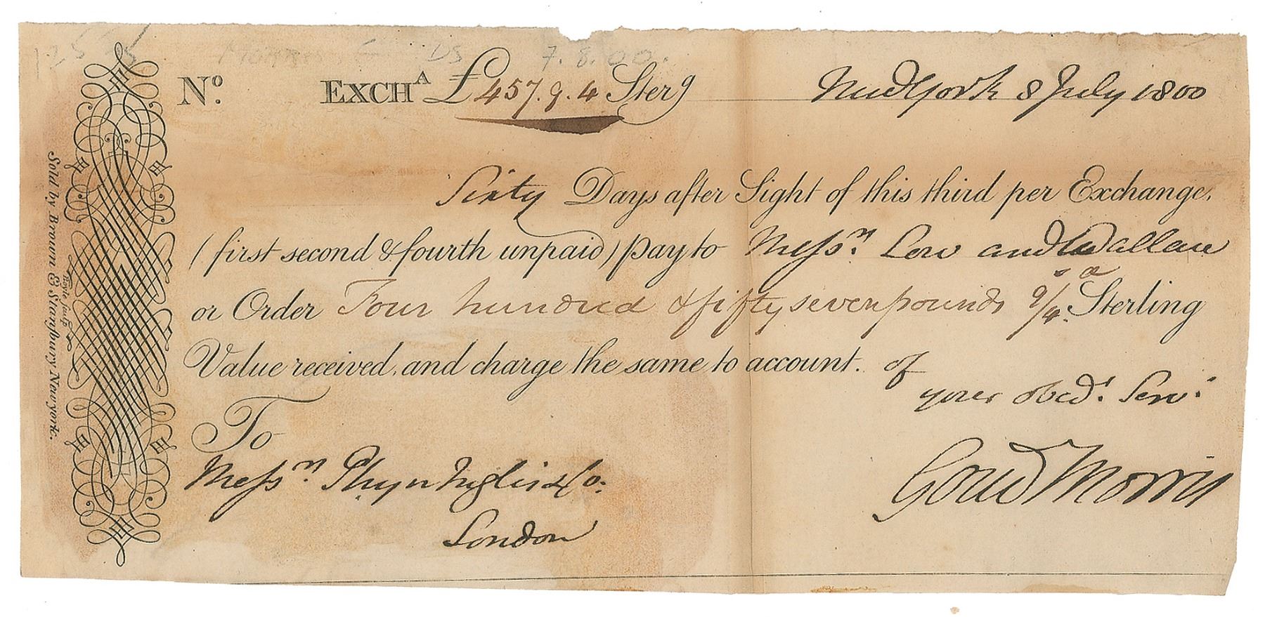 Partly-printed DS, signed “Gouv. Morris,” one page, 8.25 x 3.75, July 8, 1800. A bill of exchange, in full: "Sixty Days after Sight of this third per Exchange, (first second & fourth unpaid) pay to Mess's Lew and Wallace or Order Four Hundred & fifty seven ponds 9/4 Sterling Value received and charge the same to account." Signed boldly at the conclusion by Gouverneur Morris. In very good to fine condition, with a vertical fold and somewhat irregular toning.