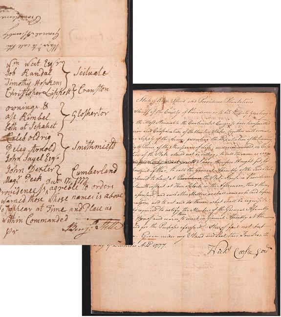 Gov. Cooke Convenes R. I. Assembly to Consider Union & Confederation (1717-1782) Governor of the colony of Rhode Island from November 1775 and subsequently first Governor of the state until 1778. On May 4, 1776, Rhode Island rescinded its oath of allegiance to King George,essentially declaring its independence two months before the Declaration of Independence was signed. Manuscript document signed ("Nichs Cooke Govr"). 1 page, 9 x 7½" (Providence), Dec. 14, 1777. An important document, calling the Rhode Island Assembly into session to consider the plan of Union and Confederation of the United States: In part: "Whereas the Most Honorable the Continental Congress have transmitted to me a Plan of Union and Confederation of the United States, together with several Resolves for the better Supply of the Army, preventing the Depreciation of the currency and lessening the high Prices of the Necessaries of Life…I have therefore thought fit, by the Advice of the Council of War, to call the General Assembly together to meet at the State House in Providence…." Listed on the verso are the names of the members of the Assembly who were called to appear. Some show-through from verso, else very good.