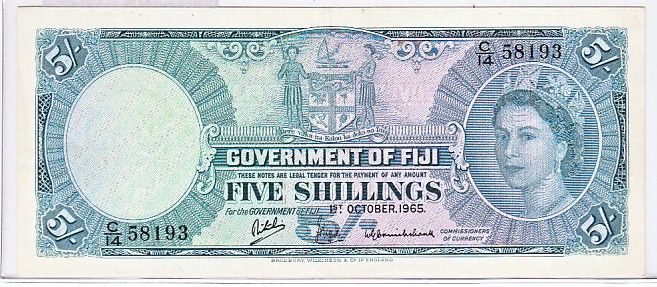Gov’t of Fiji 1965 5 Shil P51e. A Nice EF note.