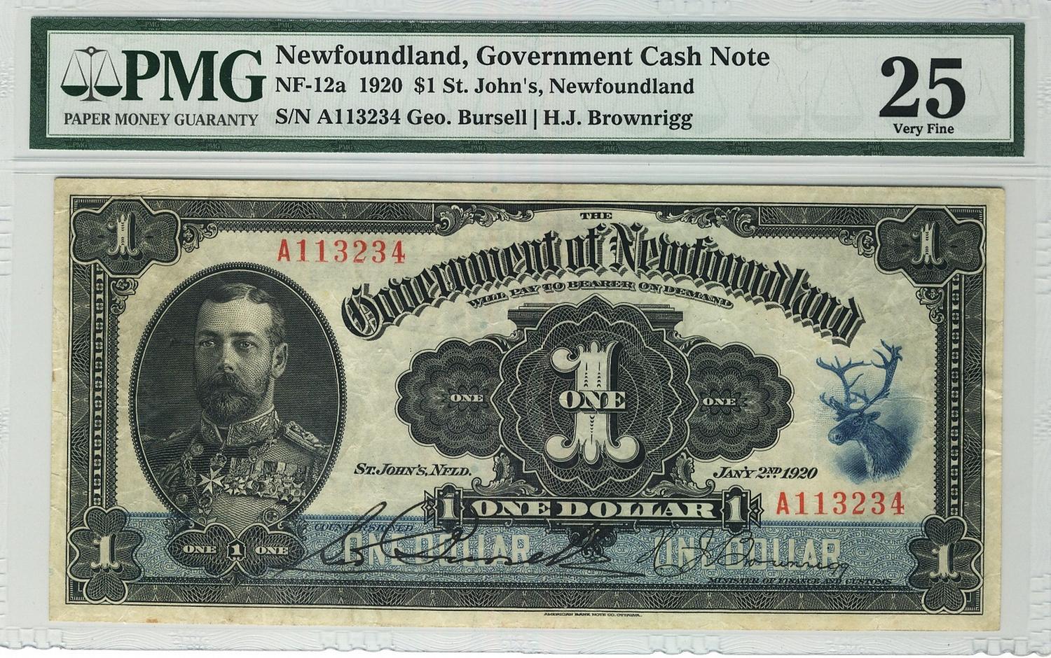 Government Cash note Nfld 1920 $1 NF-12a PMG VF25. Rare signature and exceptional grade for type. Underrated . Worth a premium bid.