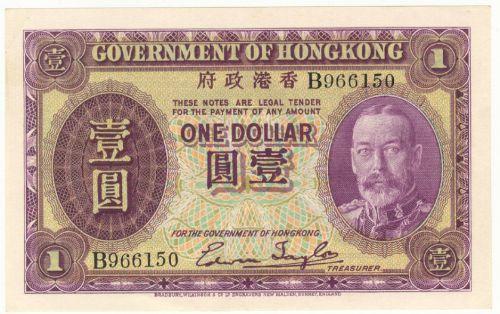 Hong Kong, Government of Hong Kong, 1 dollar with George V, issue 1935 ND, AU/UNC serial B966150, Pick number 311.
