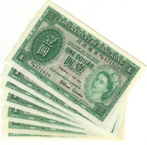 Hong Kong, Government of Hong Kong, 7 x 1 dollar, issue 1952-59, VF to UNC, Pick number 324A (a & b). Lot of 7 notes. 3 x 1952 UNC, 1956 UNC, 1957 AU, 1958 VF & 1959 EF.
