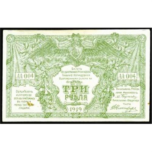 <style type="text/css"> body, td, th { font-family: Arial, Helvetica, sans-serif; font-size: 12px; color: #482424; margin: 0px; padding: 0px; } #header { background-image: url(http://www.bowersandmerena.com/ebay/images/template_v3_01.gif); clear: both; background-color: #590303; border-top-width: 2px; border-top-style: solid; border-top-color: #B38C4F; } #header #header_wrapper { height: 75px; clear: both; width: 800px; margin-right: auto; margin-left: auto; background-image: url(http://www.bowersandmerena.com/ebay/images/template_v3_03.gif); background-repeat: no-repeat; background-position: right; color: #F3EDCC; } #header #header_wrapper #header_logo { float: left; height: 75px; width: 444px; background-image: url(http://www.bowersandmerena.com/ebay/images/template_v3_02.gif); background-repeat: no-repeat; font-size: 10px; text-transform: capitalize; color: #B38C4F; } #header #header_wrapper #header_right { float: left; height: 75px; width: 356px; text-align: right; } #header #header_wrapper #header_right #headerLoginBtn { margin-bottom: 30px; } #header #header_wrapper #header_right input#txtSearch { color: #B49056; border: 1px solid #B49056; width: 175px; padding-top: 3px; padding-right: 3px; padding-bottom: 4px; padding-left: 3px; } #nav { height: 37px; background-image: url(http://www.bowersandmerena.com/ebay/images/template_v3_05.gif); clear: both; } #nav #nav_wrapper { height: 35px; width: 800px; margin-right: auto; margin-left: auto; border-left-width: 1px; border-left-style: solid; border-left-color: #B38C4F; } #nav #nav_wrapper a { padding-right: 15px; padding-left: 15px; border-right-width: 1px; border-right-style: solid; border-right-color: #B38C4F; height: 25px; padding-top: 10px; display: block; float: left; text-decoration: none; font-weight: bold; color: #5D0303; } #nav #nav_wrapper a:hover { color: #B38C4F; } #nav #nav_wrapper #search { float: right; padding-top: 7px; } #nav #nav_wrapper #search #txtSearch { font-family: Arial, Helvetica, sans-serif; font-size: 10px; text-transform: uppercase; color: #D2AE75; border: 1px solid #B38C4F; padding: 3px; } #content_bgd { background-image: url(http://www.bowersandmerena.com/ebay/images/template_v3_09.gif); background-repeat: repeat-y; background-position: center; padding-top: 15px; padding-bottom: 15px; background-color: #FBFBDB; } #content_wrapper { clear: both; height: auto; width: 800px; margin-right: auto; margin-left: auto; } .LotDetailWhite { line-height:normal; font-size:13px; font-family: arial,helvetica,sans-serif; color: White; font-weight: bold; } .LotDetailInformation { line-height:normal; font-size: 13px; font-family: arial,helvetica,sans-serif; } .LotDetailMessage { line-height:normal; font-size: 13px; font-family: arial,helvetica,sans-serif; color: red; } } tr.HeaderAuctionTitle td { color: #000000; font-weight: bold; padding: 2px; background-image: url(http://www.bowersandmerena.com/ebay/images/template_v3_05.gif); background-repeat: repeat-x; border-bottom-width: 1px; border-bottom-style: solid; border-bottom-color: #B38C4F; } table.AuctionSummary a, table.AuctionSummary a:link, table.AuctionSummary a:visited { color: #0000FF; text-decoration: none; } } td.tableHeaderLeft { border-left-width: 1px; border-left-style: solid; border-left-color: #B38C4F; } td.tableHeaderRight { border-right-width: 1px; border-right-style: solid; border-right-color: #B38C4F; } td.tableCellMiddle { border-left-width: 1px; border-left-style: solid; border-left-color: #B38C4F; border-right-width: 1px; border-right-style: solid; border-right-color: #B38C4F; padding: 5px; } tr.footer td { border-top-width: 1px; border-top-style: solid; border-top-color: #B38C4F; } </style> </head> <body> <div id="header"> <div id="header_wrapper"> <div id="header_logo"> </div> <div id="header_right"> </div> </div> </div> <div id="nav"> <div id="nav_wrapper"> <a href="http://www.bowersandmerena.com">Our eBayLive Auctions</a> <a href="#PaymentInfo">Payment Information</a> <a href="#ShippingInfo">Shipping Information</a> <a href="#About">About Bowers and Merena</a> </div> </div> <div id="content_bgd"> <div id="content_wrapper"> <table width="100%" border="0" cellpadding="5" cellspacing="0" class="AuctionSummary"> <tbody> <tr class="HeaderAuctionTitle" style="height: 25px;"> <td align="left" class="tableHeaderLeft" > </td> <td align="center" class="tableHeaderRight"> <span style="font-size: large;">Lot #2086. South Russia. Government Treasury Notes 1919 Issue.</span> </td> </tr> <tr> <td colspan="3" class="tableCellMiddle"> Lot of 10 notes, all are1919 issues, 3 Rubles to 10,000 Rubles, (missing the 1000 Ruble Note, P-S420 to P-S425 with a couple of notes duplicated, Fine to AU condition.
