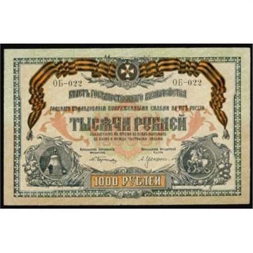<style type="text/css"> body, td, th { font-family: Arial, Helvetica, sans-serif; font-size: 12px; color: #482424; margin: 0px; padding: 0px; } #header { background-image: url(http://www.bowersandmerena.com/ebay/images/template_v3_01.gif); clear: both; background-color: #590303; border-top-width: 2px; border-top-style: solid; border-top-color: #B38C4F; } #header #header_wrapper { height: 75px; clear: both; width: 800px; margin-right: auto; margin-left: auto; background-image: url(http://www.bowersandmerena.com/ebay/images/template_v3_03.gif); background-repeat: no-repeat; background-position: right; color: #F3EDCC; } #header #header_wrapper #header_logo { float: left; height: 75px; width: 444px; background-image: url(http://www.bowersandmerena.com/ebay/images/template_v3_02.gif); background-repeat: no-repeat; font-size: 10px; text-transform: capitalize; color: #B38C4F; } #header #header_wrapper #header_right { float: left; height: 75px; width: 356px; text-align: right; } #header #header_wrapper #header_right #headerLoginBtn { margin-bottom: 30px; } #header #header_wrapper #header_right input#txtSearch { color: #B49056; border: 1px solid #B49056; width: 175px; padding-top: 3px; padding-right: 3px; padding-bottom: 4px; padding-left: 3px; } #nav { height: 37px; background-image: url(http://www.bowersandmerena.com/ebay/images/template_v3_05.gif); clear: both; } #nav #nav_wrapper { height: 35px; width: 800px; margin-right: auto; margin-left: auto; border-left-width: 1px; border-left-style: solid; border-left-color: #B38C4F; } #nav #nav_wrapper a { padding-right: 15px; padding-left: 15px; border-right-width: 1px; border-right-style: solid; border-right-color: #B38C4F; height: 25px; padding-top: 10px; display: block; float: left; text-decoration: none; font-weight: bold; color: #5D0303; } #nav #nav_wrapper a:hover { color: #B38C4F; } #nav #nav_wrapper #search { float: right; padding-top: 7px; } #nav #nav_wrapper #search #txtSearch { font-family: Arial, Helvetica, sans-serif; font-size: 10px; text-transform: uppercase; color: #D2AE75; border: 1px solid #B38C4F; padding: 3px; } #content_bgd { background-image: url(http://www.bowersandmerena.com/ebay/images/template_v3_09.gif); background-repeat: repeat-y; background-position: center; padding-top: 15px; padding-bottom: 15px; background-color: #FBFBDB; } #content_wrapper { clear: both; height: auto; width: 800px; margin-right: auto; margin-left: auto; } .LotDetailWhite { line-height:normal; font-size:13px; font-family: arial,helvetica,sans-serif; color: White; font-weight: bold; } .LotDetailInformation { line-height:normal; font-size: 13px; font-family: arial,helvetica,sans-serif; } .LotDetailMessage { line-height:normal; font-size: 13px; font-family: arial,helvetica,sans-serif; color: red; } } tr.HeaderAuctionTitle td { color: #000000; font-weight: bold; padding: 2px; background-image: url(http://www.bowersandmerena.com/ebay/images/template_v3_05.gif); background-repeat: repeat-x; border-bottom-width: 1px; border-bottom-style: solid; border-bottom-color: #B38C4F; } table.AuctionSummary a, table.AuctionSummary a:link, table.AuctionSummary a:visited { color: #0000FF; text-decoration: none; } } td.tableHeaderLeft { border-left-width: 1px; border-left-style: solid; border-left-color: #B38C4F; } td.tableHeaderRight { border-right-width: 1px; border-right-style: solid; border-right-color: #B38C4F; } td.tableCellMiddle { border-left-width: 1px; border-left-style: solid; border-left-color: #B38C4F; border-right-width: 1px; border-right-style: solid; border-right-color: #B38C4F; padding: 5px; } tr.footer td { border-top-width: 1px; border-top-style: solid; border-top-color: #B38C4F; } </style> </head> <body> <div id="header"> <div id="header_wrapper"> <div id="header_logo"> </div> <div id="header_right"> </div> </div> </div> <div id="nav"> <div id="nav_wrapper"> <a href="http://www.bowersandmerena.com">Our eBayLive Auctions</a> <a href="#PaymentInfo">Payment Information</a> <a href="#ShippingInfo">Shipping Information</a> <a href="#About">About Bowers and Merena</a> </div> </div> <div id="content_bgd"> <div id="content_wrapper"> <table width="100%" border="0" cellpadding="5" cellspacing="0" class="AuctionSummary"> <tbody> <tr class="HeaderAuctionTitle" style="height: 25px;"> <td align="left" class="tableHeaderLeft" > </td> <td align="center" class="tableHeaderRight"> <span style="font-size: large;">Lot #2087. South Russia. Government Treasury Notes 1919 Issue.</span> </td> </tr> <tr> <td colspan="3" class="tableCellMiddle"> Lot of 5 different color, series and watermark varieties of the 1000 Rubles, P-S424. Condition varies between VF+ to CU.