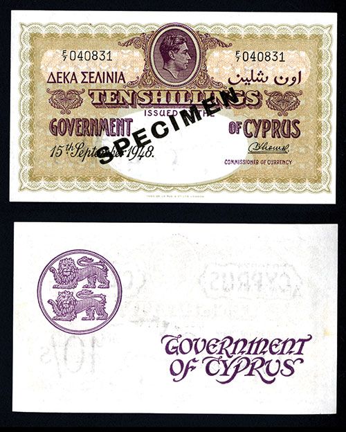 Cyprus, 1948, 10 Shillings, P-23 Unlisted Specimen banknote, King George VI at center top, Specimen overprint, normal S/N F/7 040831, Choice AU with one very light fold keeping this lovely note from CU condition.
