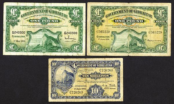 Gibraltar. 10 Shillings, 1 Pound. SCWPM 14b, 15a, 18a. Very Good to Fine, the first with a hole at the center fold. 3 pieces.