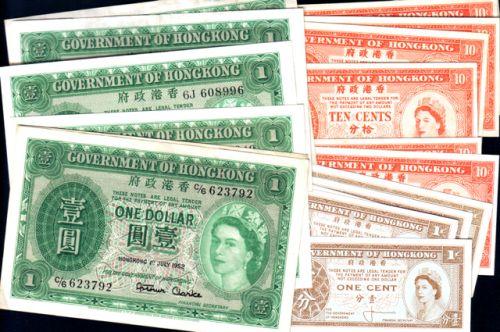 Government of Hong Kong, Queen Elizabeth: One Dollar 1952 VF-EF, 1955 VF, 1956 Unc, 1958 Unc and 1959, three notes, Unc, VF and VF with writing. Plus 10 Cents, ten notes, Unc and One Cent, five notes, one EF the others Unc. Total twenty-two notes