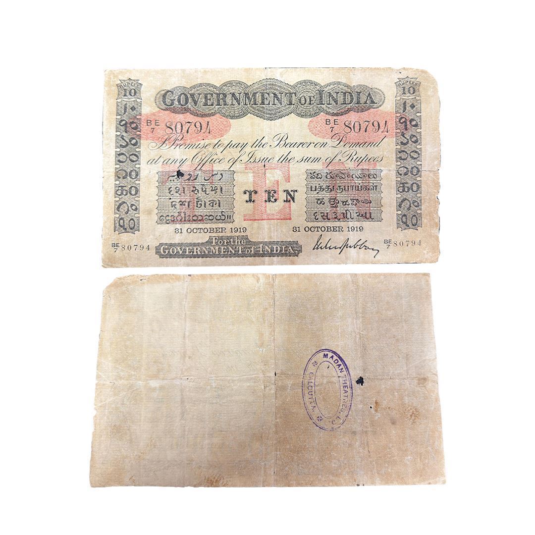 Government of India, George V, Uniface, 10 rupees, 4th issue, Red underprint, Universalised circle, dated 31 October 1919, signed by M.M.S. Gubbay, serial no.: BE7 80794, four serial numbers on all corners, J& amp;R 2A.2.4.1, fold marks. Very fine, Very rare.
