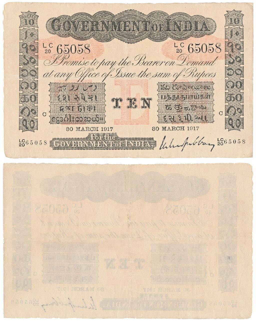 Government of India, Uniface, Rupees 10, red under print, Calcutta Circle, signed M.M.S. Gubbay, 30 March 1917, (J&R 2A.2.3A.3). Extremely Fine, Rare.