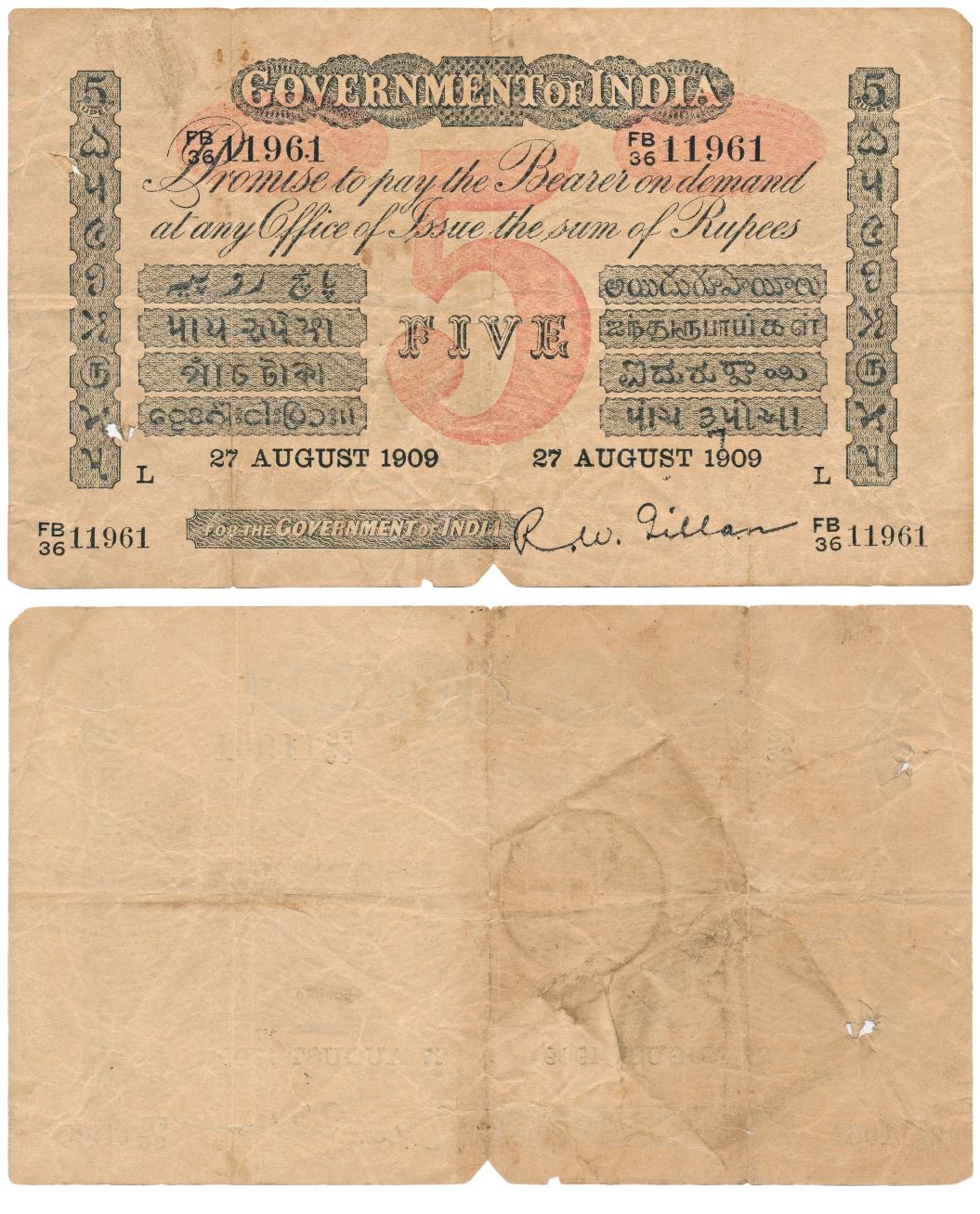 Government of India, Uniface, Rupees 5, red under print, Lahore Circle, signed R. W. Gillen, 27 August 1909, prefix unrecorded (J&R 2A.1.4E.3). Very Fine, Rare signature.