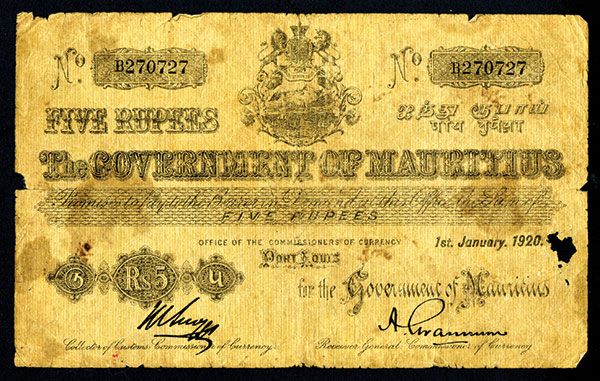 Mauritius, issued note, 5 Rupees, 1-1-1920, P-16, VG and scarce.