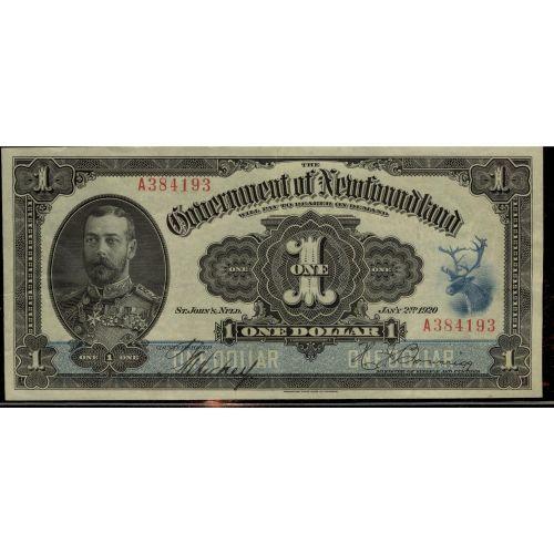 Government of Newfoundland, NF-12b 1920 $1 A384193. A bright EF+ example. Scarce!