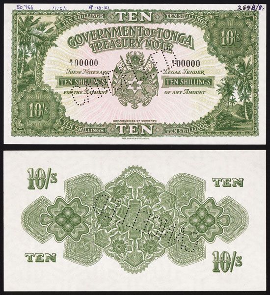 Tonga, ND (1951 written on top margin in ink), 10 Shillings, P-10b Unlisted Specimen banknote, Green on m/c underprint, arms in middle, palm trees on left and right, back green, Pin punch CANCELLED, S/N B/1 00000, Archival notations on top margin ÒSO766 - 111011Ó, Ò18-10-51Ó and Ò259B/8Ó, the note appears CU but rough archival handling and internal bends on the right margin and faint fold on the upper left corner leaves this lovely, crisp and brightly colored note a Choice to Gem XF to AU, rare as specimen and this is the scarcer earlier issue. TDLR.