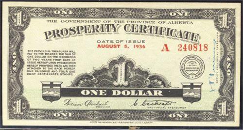 Government of the Province of Alberta, Prosperity certificate 1936 $1 A-1 No.A240818 A bright uncir