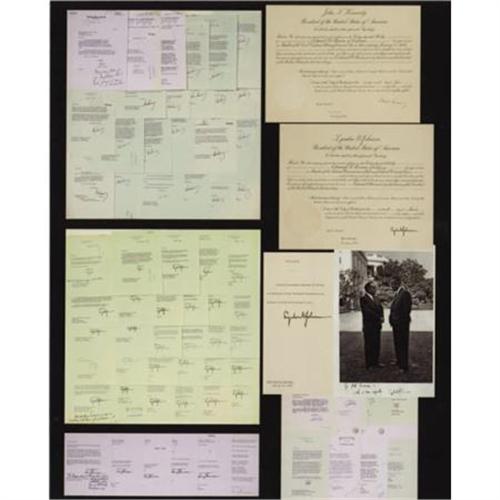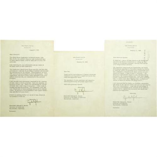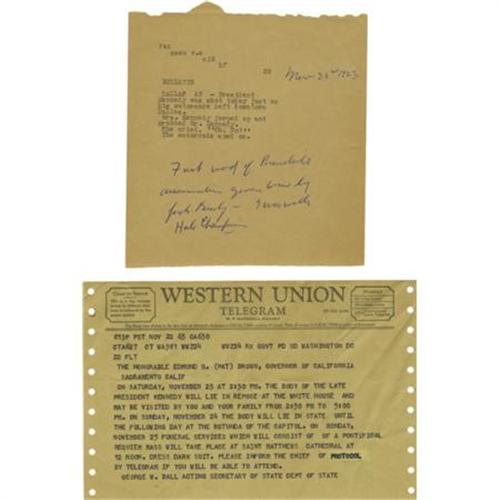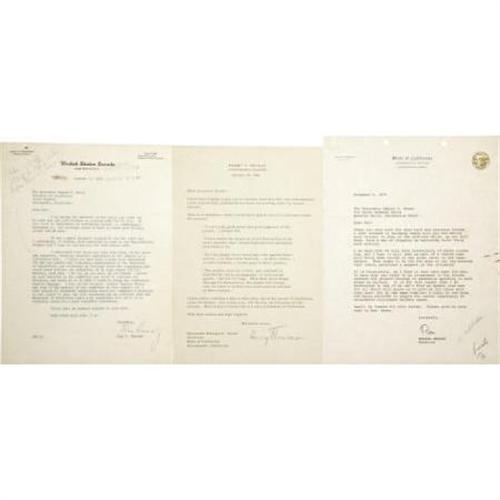 <B>A Superb Archive of 94 Items from Former California Governor Edmund G. "Pat" Brown.</B></I> <BR><BR>Rarely, if ever, does one encounter privately-held groupings such as this including the private communications of five different American presidents to a major political figure.<BR><BR>Edmund G. "Pat" Brown was governor of California from 1959 through 1967, and one of the most influential Democratic Party powers of that era. He first defeated a popular Republican Senator, William F. Knowland by 20 points, and then defeated former presidential nominee and vice president Richard Nixon in an epic re-election campaign. Governor Brown’s son, Edmund “Jerry” Brown, Jr., was elected to the first of two terms as California Governor in 1974, while daughter Kathleen was elected the state treasurer in 1990. She lost a gubernatorial bid in 1994. <BR><BR>Offered here is an outstanding grouping of letters and other items received by Pat Brown as governor. The Archive was given by Brown to a close political confidant, Frank W. Cullen, who co-founded the Edmund G. “Pat” Brown Institute of Governmental Affairs affiliated with California State University, Los Angeles. A bill of sale for the archive from Cullen to the present consignor accompanied this lot. Also included is a 2006 letter from California Secretary of State Bruce McPherson, the content of which confirms the legitimacy of Cullen’s private ownership of these materials.<BR><BR>These letters, almost all of presidential date, deal with the important issues of the day, both to the nation and to California in particular: environmental protection, trade, civil defense, the Food for Peace and Alliance for Progress programs, unemployment, federal and state taxation, highway safety, shipbuilding and shipyards, the War on Poverty and the war in Vietnam, Watergate, and the crucial task of bringing government to the people. Of course, California being a basin state, many letters are concerned, in depth, with water - its conservation, development, and role in Mexico-United States relations. All of the letters are noteworthy for both their specificity - the concern, say, for steelhead trout - and for their sweeping sense of history.<BR><BR>The 22 President Kennedy letters emphasize America’s role as the leader of the Free World, and so depict a president at once politically realistic and eloquently visionary. The 33 President Johnson letters evidence his famous grasp of the nuts-and-bolts governance. Both are telling portraits, set against the vivid history of the growing West.<BR><BR>Richard Nixon is represented here with five surprisingly warm letters - three as president, including an excellent one about Watergate. The three Ronald Regan letters, two as governor and one as president, are cordial, and the six Trumans, one is stellar: the ex-president writes about the political wisdom of the American people and how he, as president, responded to it.<BR><BR>The content of the letters is uniformly fine and the condition, throughout, excellent.<BR><BR>Some selected highlights:<BR><BR><B>1.</B></I> Typed letter signed, as former president Harry S. Truman, 1 page, quarto, on green Harry S. Truman letterhead, Independence, Missouri, October 19, 1966,. To Governor Brown: <I>“Dear Governor Brown: I have been hoping to pay you a courtesy visit this fall, but unfortunately, I find myself still confined to my home recovering from my recent illness. This is the substance what I would have said to you if I could have made the journey: Trust to the good sense and good judgment of the people. I always did. I have known the people to prove themselves to be much smarter than certain high-powered operators took them to be. For the people never knowingly vote against them-selves, - or their best interest, - or their future, - or their welfare, - or the good of their country. The people, may for a time, get confused or diverted by clever propaganda, or slick press agents - but not for long. When they think things through for themselves, the people will always vote for what is in their own best interest and that of their country. I have every confidence that same sprit the people of California, come November, will return you, Pat Brown, as Governor of California. This is how I would vote if I were a resident of California. With best wishes and high regards Sincerely yours, </B></I><B><I>Harry S. Truman</B></I></B></I><I>” </B></I>A <B>superlative</B></I> letter!! In very fine condition.<BR> <BR><B>Presidential letter to California Governor Edmund G. ‘Pat’ Brown, from President Nixon on The Watergate Incident </B></I>Typed Letter Signed, as President, initials (RN) 1 page, quarto, on green White House letterhead, Washington, May 24, 1973. To Governor Brown: <I>Dear Pat: Of all the letters I have received in recent weeks, yours had special meaning for me, coming as it does from one with your long experience in political and public life. I do recall that afternoon in Candlestick Park and the incident you mentioned. Since then, both of us have known our share of boos along with the cheers. Now, of course, the developments of these past months have posed a very great test of our Administration. But as I have repeatedly stated, we shall not fail to bring this entire matter to a full and just resolution. At the same time, we will not be deterred from working toward the goals the American people elected us to achieve. Your message of support and goodwill at this time renews my confidence that we will meet this test. With my deep appreciation for your thoughtfulness in writing and my warmest personal regards, sincerely, signed RN (Richard Nixon).<BR></B></I> <BR><B>Presidential letters to California Governor Edmund G. ‘Pat’ Brown, from President Kennedy</B></I> <BR><B><BR>1.</B></I> <B>“President Kennedy was shot today”</B></I> The very first Associated Press Wire Bulletin announcing that the President had been shot: "<I>Dallas AP- President Kennedy was sh