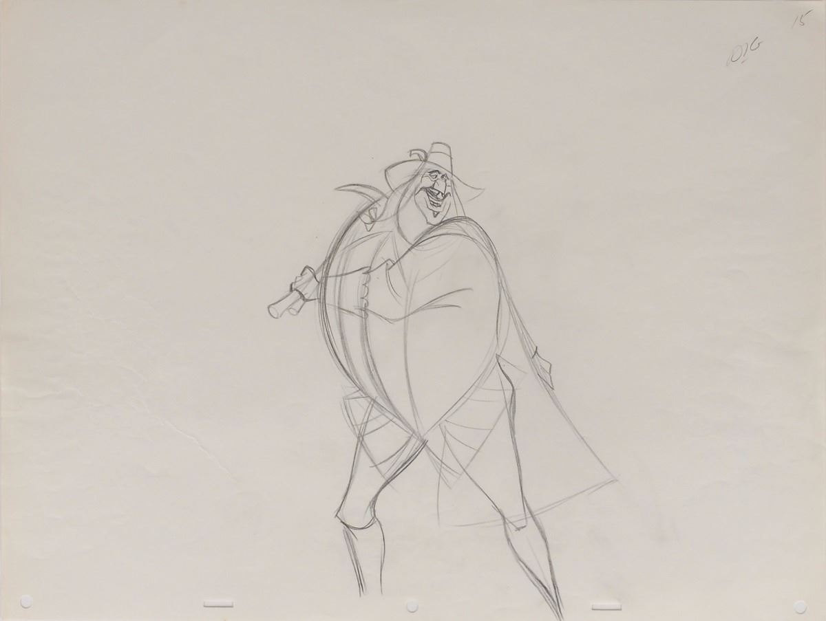 (Walt Disney Studios, 1995) Original rough production drawing featuring Governor Ratcliffe from Pocahontas, depicting him swinging a pickaxe. Accomplished in graphite on untrimmed 17 x 12.5 animation paper. Image measures 6.75 x 9.5. In fine condition.