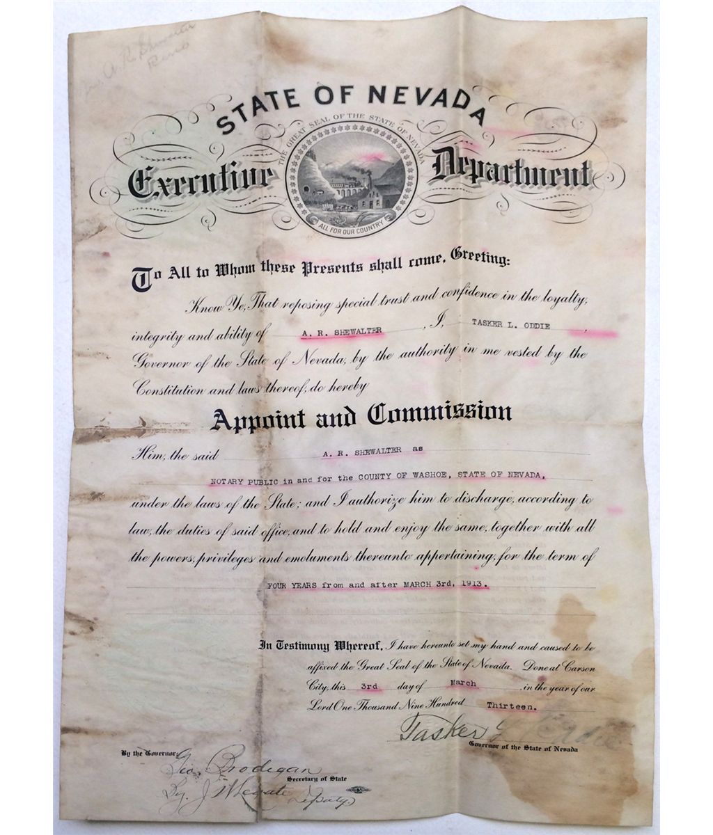 1913 official appointment by Tasker Oddie appointing A. R. Shewalter as Notary Public. Signed by Oddie (part of signature is soiled and faint) and George Brodigan. One tear, and some water damage.