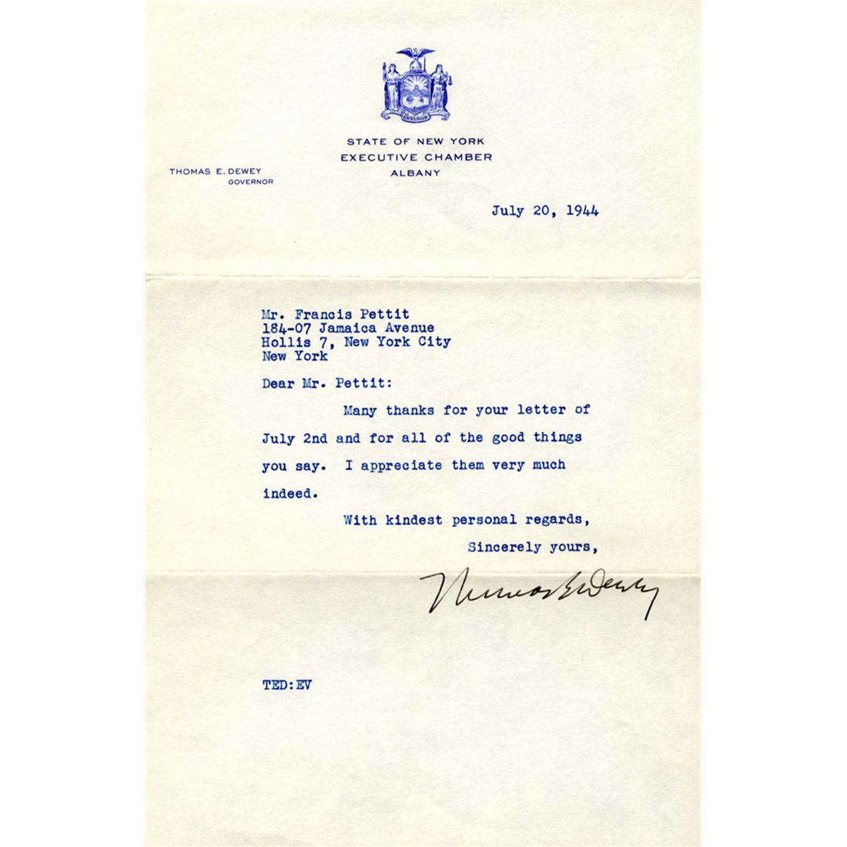 Typed letter signed by New York Governor Thomas Dewey dated 20 July 1944 on State of New York Executive Chamber letterhead. Addressed to Francis Pettit, letter reads: ''Dear Mr. Pettit: Many thanks for your letter of July 2nd and for all of the good things you say. I appreciate them very much indeed. With kindest personal regards. Sincerely yours, [signed] Thomas E. Dewey''. 1944 was the year Dewey lost his second presidential bid to incumbent Franklin Delano Roosevelt. 7.25'' x 10.5'' letter has expected folds and toning. Very good.