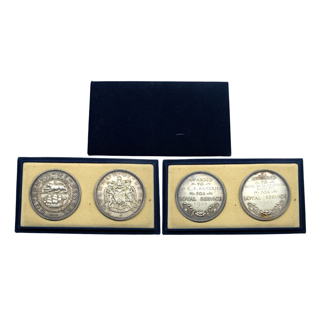Governor of Bengal Presentation Medal ( 2 ) , first one Silver, 92.60g, arms of the Governor in center on obv, awarded to Babu Bata Krishna Banerji for Loyal Service 1943 and a wreath below . Second one is also Governor of Bengal Presentation Medal, Silver, 92.70g, obv. a tiger to left and a ship below, rev. awarded to Mr. K. P. Banerjee for Loyal Service 1946 with a wreath below (Pudd 944.5.2) (Type II).About Uncirculated, Very Rare.