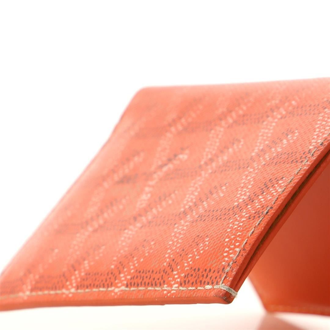 Goyard Orange Coated Canvas Saint Pierre Card Case Condition Details: Wear and stickiness on exterior, heavy spitting, cracking and peeling on base and opening corner wax edges, moderate wear, darkening and marks in interior. Measurements: Height 4.