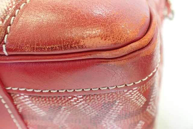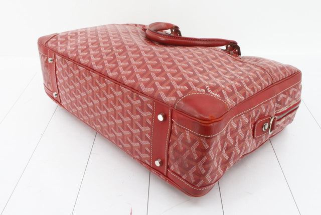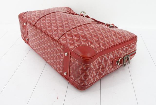One Goyard Red Goyardine Ambassade MM Briefcase. Item is sold AS-IS. All available information is listed in the description and shown in the photo. Red Goyardine Chevron monogram Goyard Ambassade MM briefcase features dual rolled leather top handles with silver-tone buckles, a facing patch pocket, and leather trim. The wrap around zipper opens to a mango yellow fabric interior with pockets. Length: 16.5 in Height: 11.75 in Width: 4.25 in Handle Drop: 4.5 in