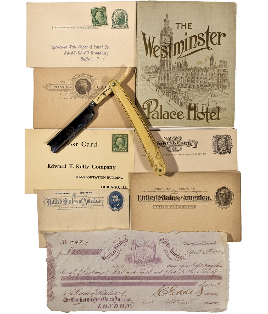 Lot of 4) Original Box, H. Boker straight razor with faux ivory handle, blade has name and providence stamped on handle and engraved on the blade. B) The Westmister Palace Hotel promotional information booklet- info on hotel services, events and amenities. Valid for the years 1866-67. "Delicate" C) Bank of British North America stock certificate- "Incorporated by Royal Charter", issued for 20 pounds. Bradford Branch, London. Signed by H. Robinson- Accountant and unknown Manager. Fair. U/C, Rough Edges. D) Postal Covers, vignettes of Thomas Jefferson includes UX9, UX12, UX7, UX11, UX5.City: County: State: