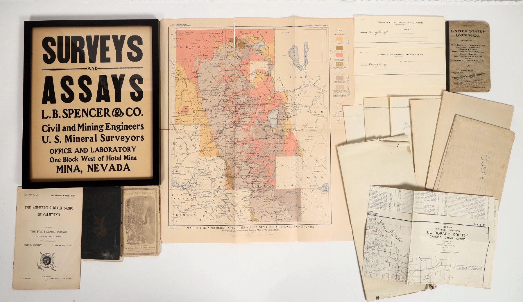 Lot of 16.. 12x15" framed poster "Survey's and Assay's L.B. Spencer & Co. Mina, Nevada". Nine mine maps I.E.; Rainbow Extension mine, Allegheny District Principal mine works, El Dorado County Mining Claim plus four more.. Letter Head from Natomas Consolidated of California. Two pocket notebook : Glidden Steel Barb Wire and United States Gypsum. Pamphlet "The Auriferous Black Sands of California (1907). Calif. Mining Bureau mineral production chart 1887-1905.