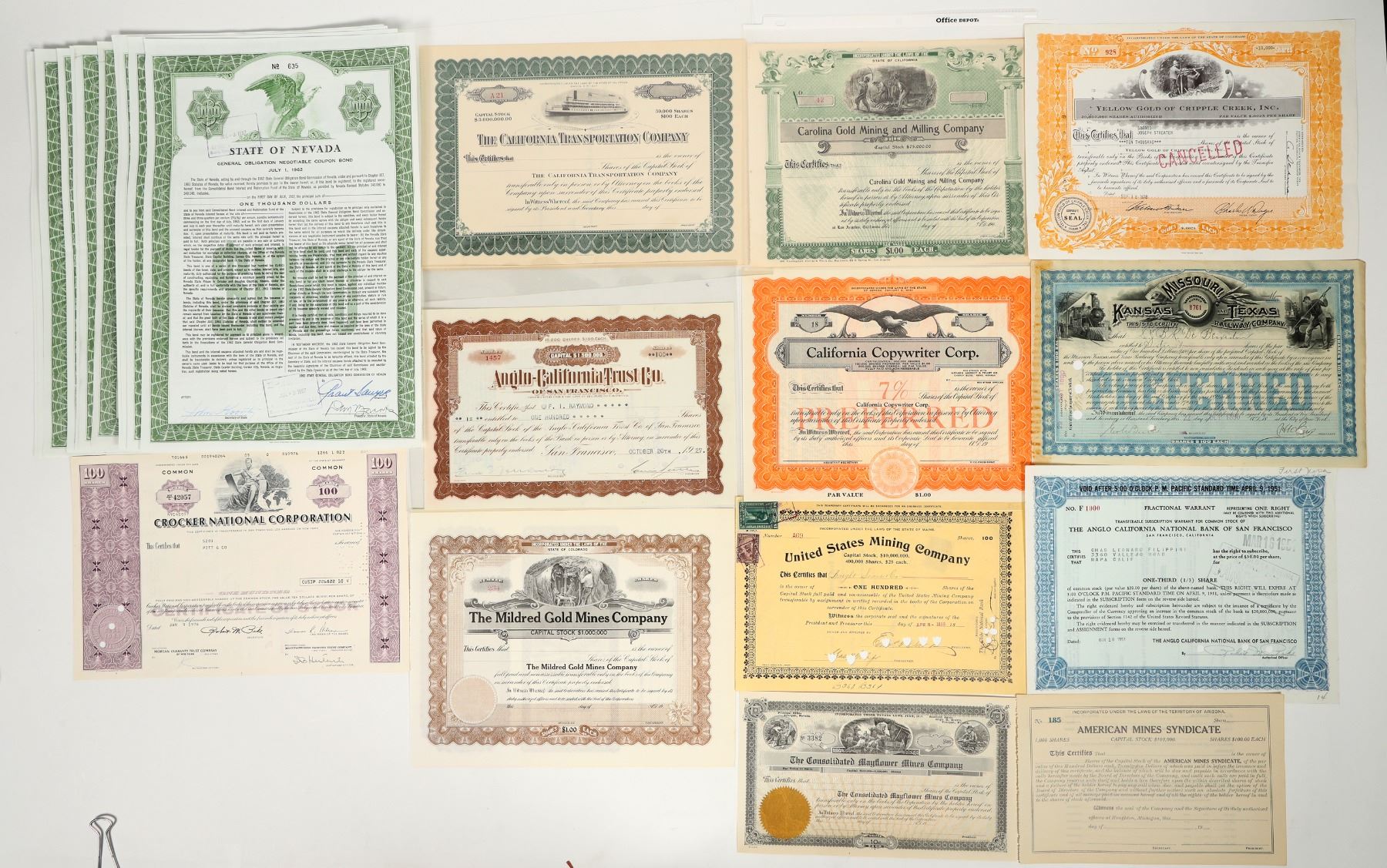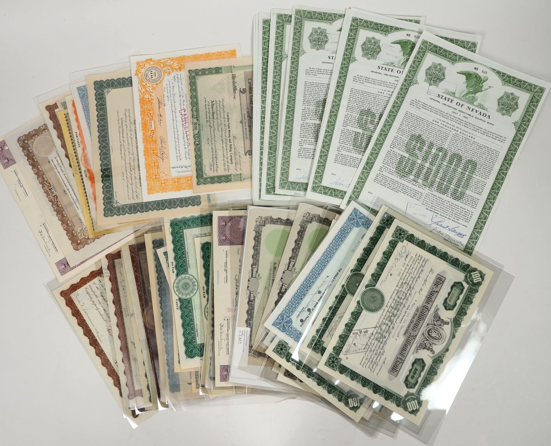 Lot of 60. U/U, I/U, I/C. State, Mining, Oil Bonds. Examples: State of Nevada General Obligation Bond signed by ex-Governor Grant Sawyer(actual sig)., California Mines Corp., Bunker Hill Consolidated Mining Co., The California Transportation Co. , Anglo California National Bank, Cal-Tex Oil Corp.