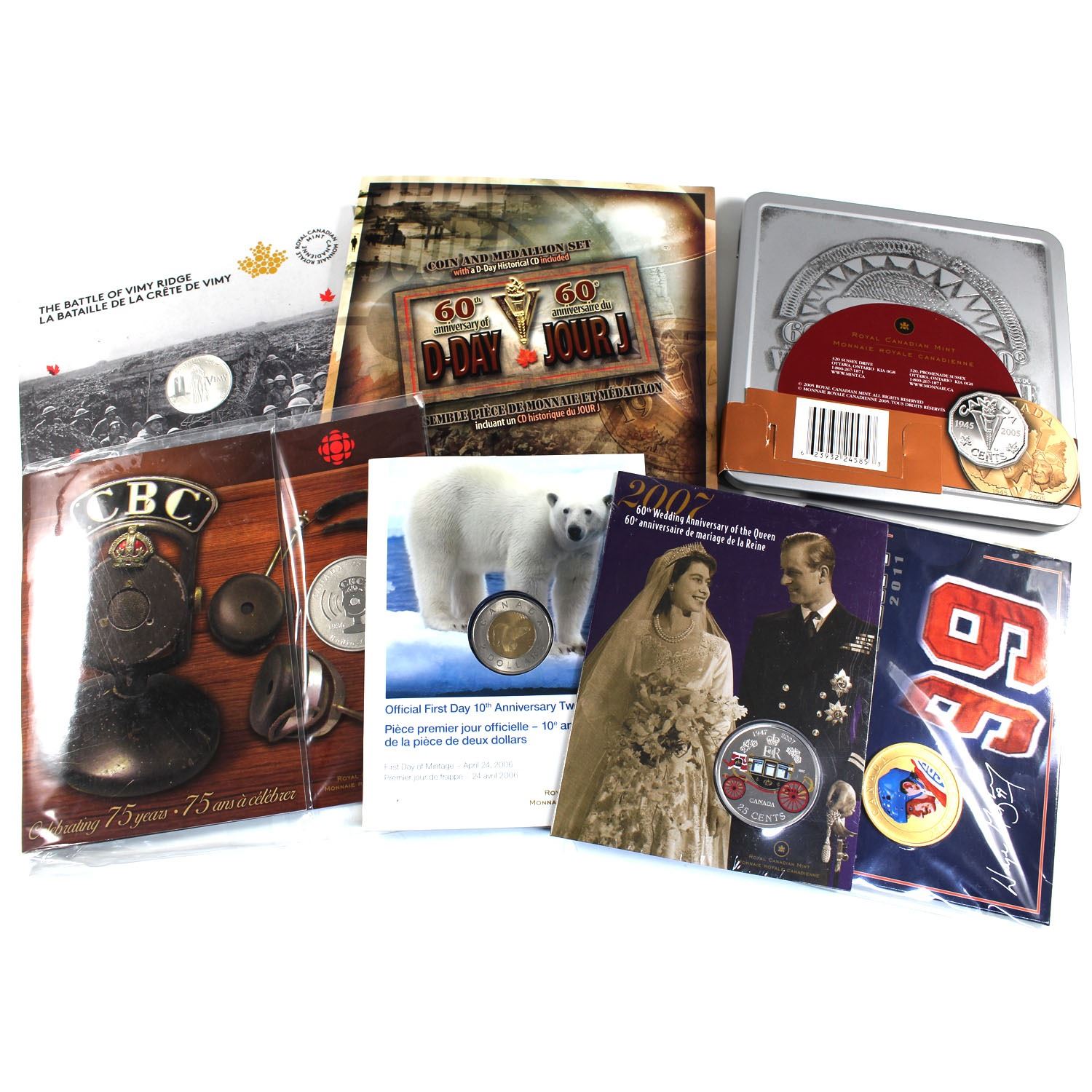Grab Bag of 7x Royal Canadian Mint Commemorative Coins and Sets. Lot includes: 2017 Silver $3 Vimy Ridge, 2004 D-Day Silver 5-cent & Medallion set, 2005 60th Anniversary End of WWII Set, 2011 25-cent C.B.C Radio, 2011 25-cent Wayne Gretzky, 2007 25c 60th Wedding Anniversary, & 1996-2006 First Day $2.
