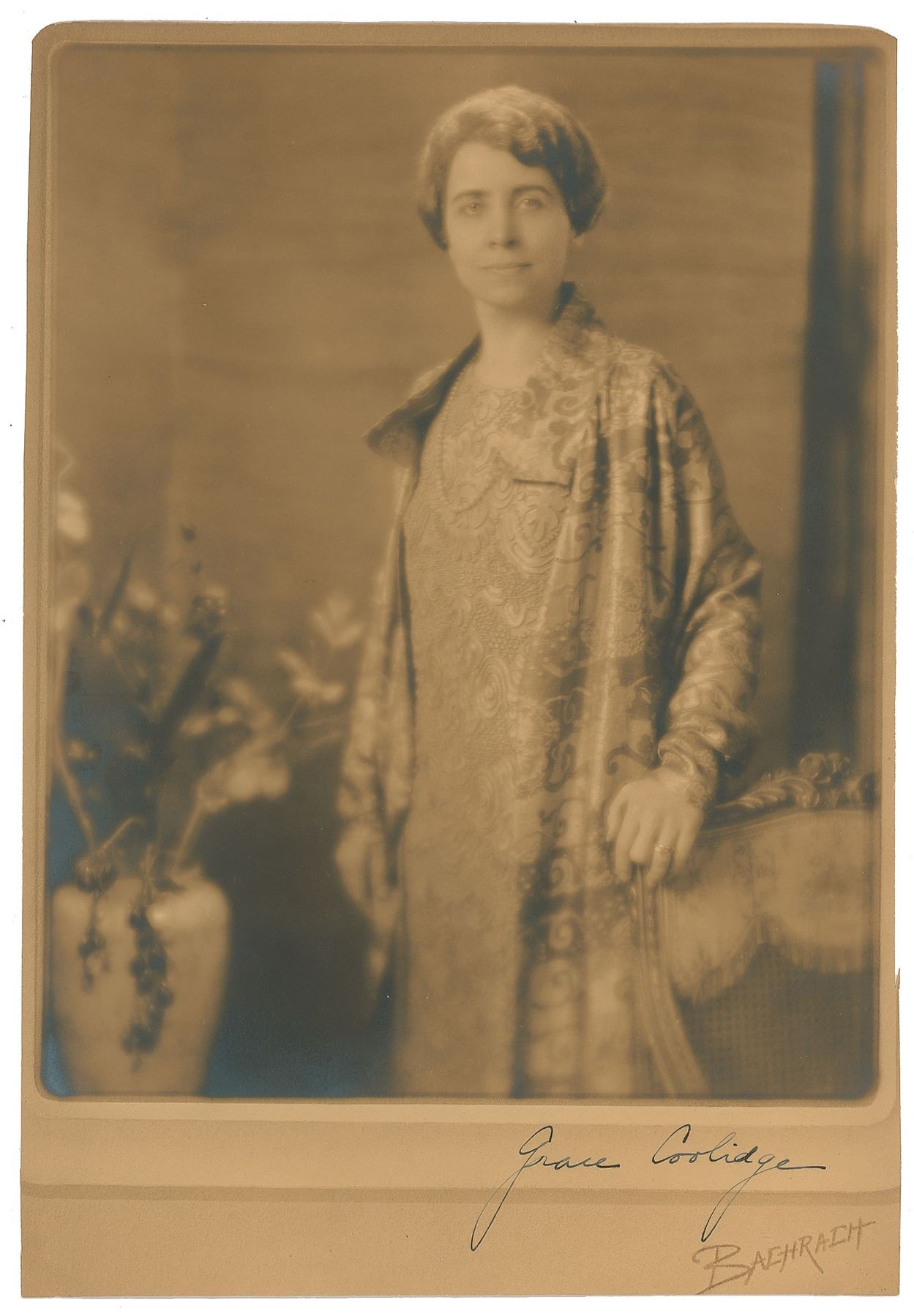 Attractive vintage sepia matte-finish 7.25 x 10.75 Bachrach photo of Coolidge in a three-quarter-length pose, signed in the lower border in fountain pen, "Grace Coolidge." In fine condition, with trimmed edges.