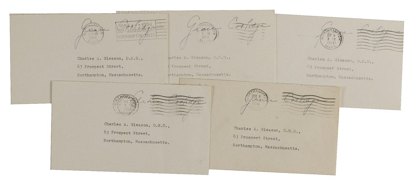 Five free franked envelopes, each 6.5 x 3.75 and typewritten to her dentist, Charles A. Gleason, in Northampton, Massachusetts. Each fis ranked in ink in the upper right, “Grace Coolidge.” Postmarked between 1953 and 1956 with postal cancellations through each signature. Some light staining and handling wear to each, otherwise overall fine condition.