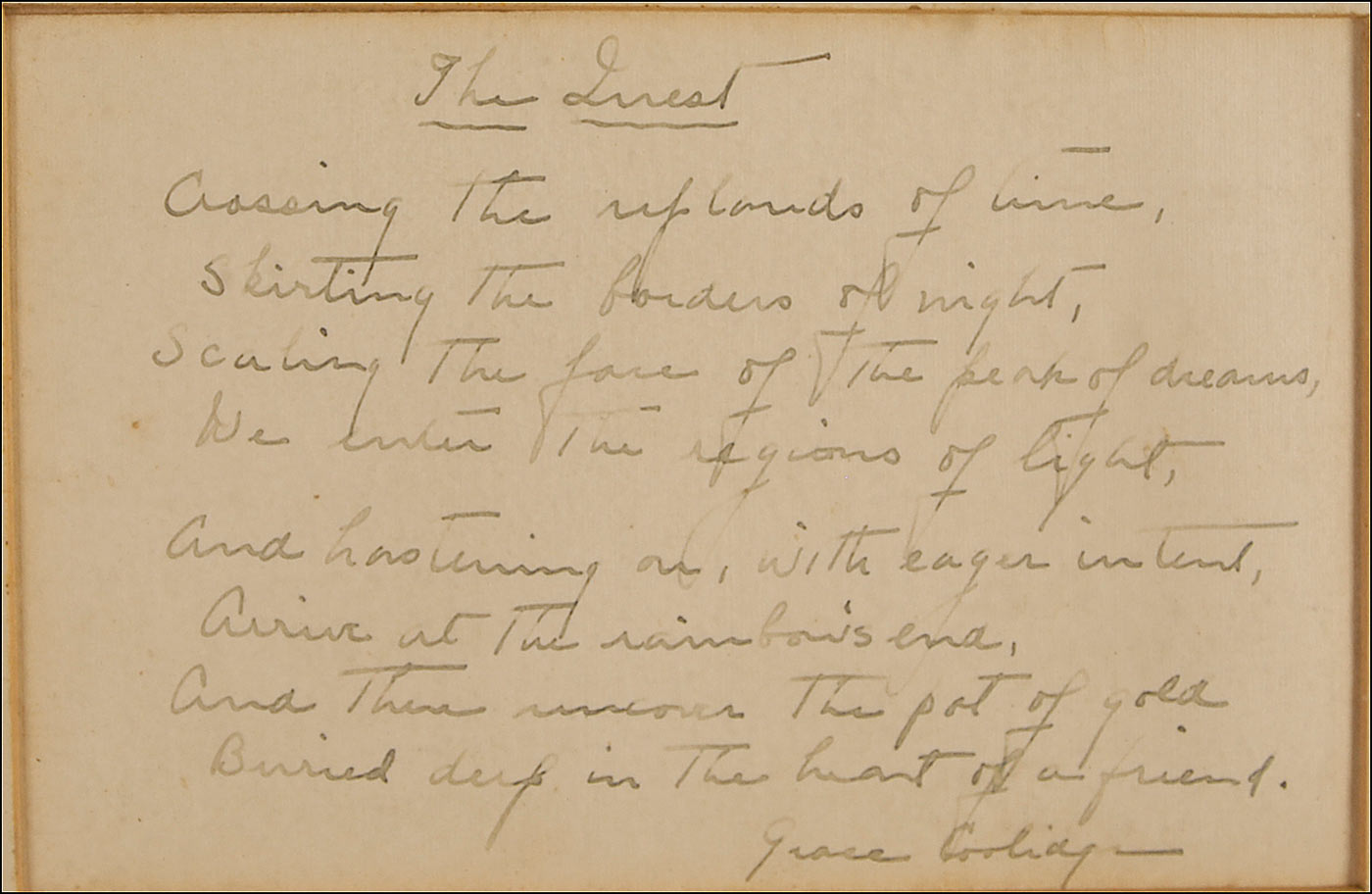 Scarce AQS on an off-white 5 x 3.25 sheet, signed at the conclusion, “Grace Coolidge.” Coolidge pens her poem, “The Quest.” In full, “Crossing the uplands of time, Skirting the borders of night, Scaling the face of the peak of dreams, We enter regions of light, And hastening on, with eager intent, Arrive at the rainbow’s end, And there uncover the pot of gold, Buried deep in the heart of a friend.” Matted and framed to an overall size of 8 x 6. Mild shade of toning and a few spots of soiling, otherwise fine condition. An uncommon and desirable example of her light-hearted 1930 literary contribution.