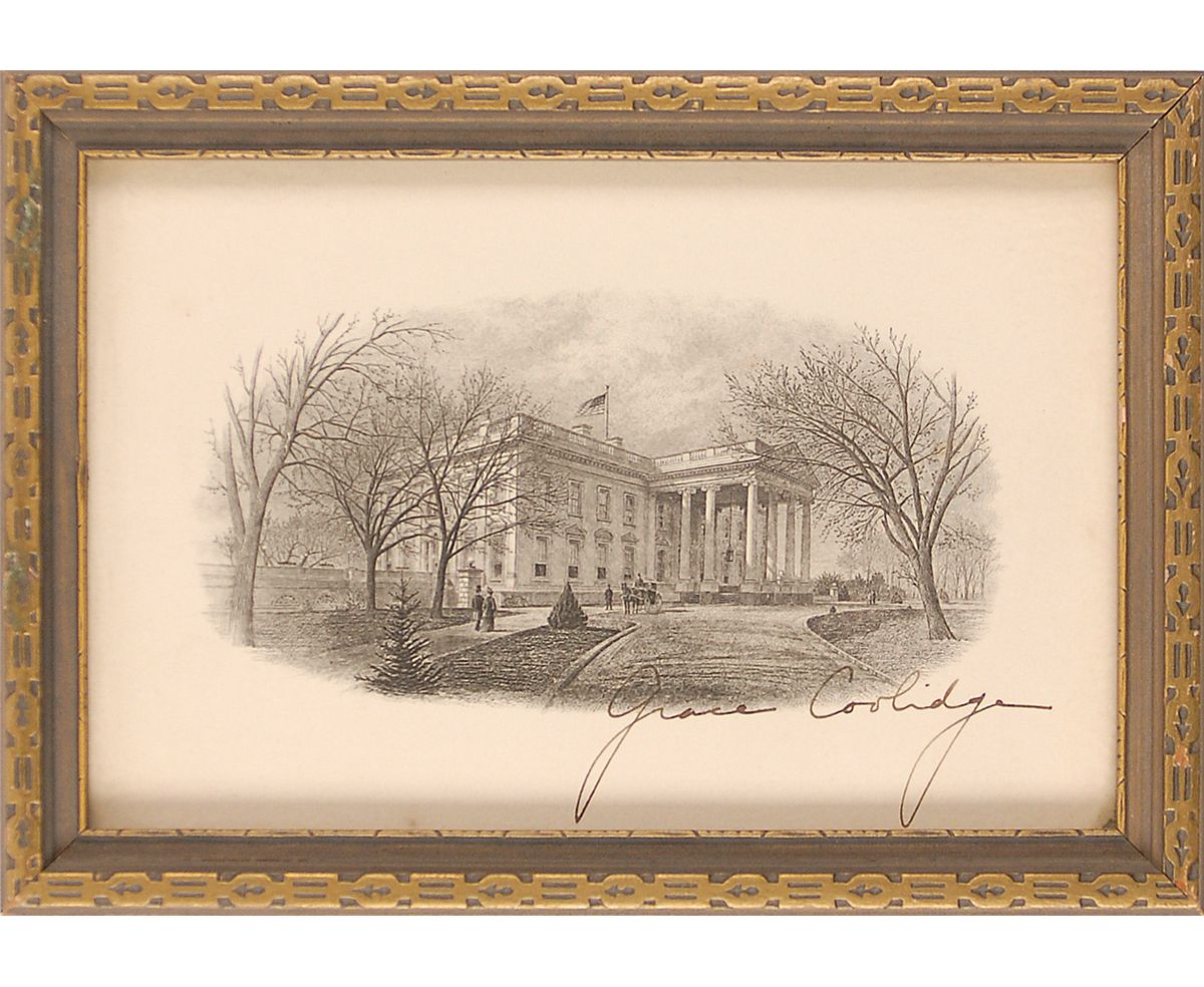 Engraving of the exterior of the White House, 5.75 x 3.75, signed in the lower right in fountain pen. Framed to an overall size of 6.5 x 4.5. In fine condition.