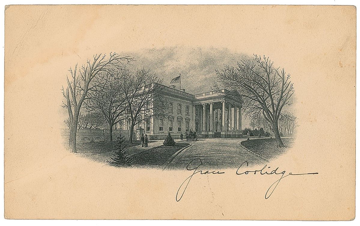 Appealing engraving of the North Portico of the White House, 6.5 x 4, signed in fountain pen by Grace Coolidge. In very good to fine condition, with light overall soiling, and light dampstaining to the upper left corner.