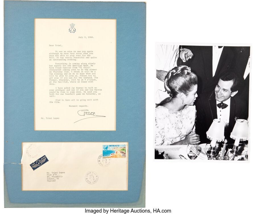 Grace Kelly Signed Letter To Trini Lopez. A typed letter from Grace Kelly (dated July 9, 1966) to Trini and signed in the bottom right corner with black ink. Matted with original envelope to an overall 17" x 11 ¾". Features a tear in the matte and onto the envelope. In Very Good condition. Comes with an 8" x 10" black and white photo of Grace with Trini. COA from Heritage Auctions.