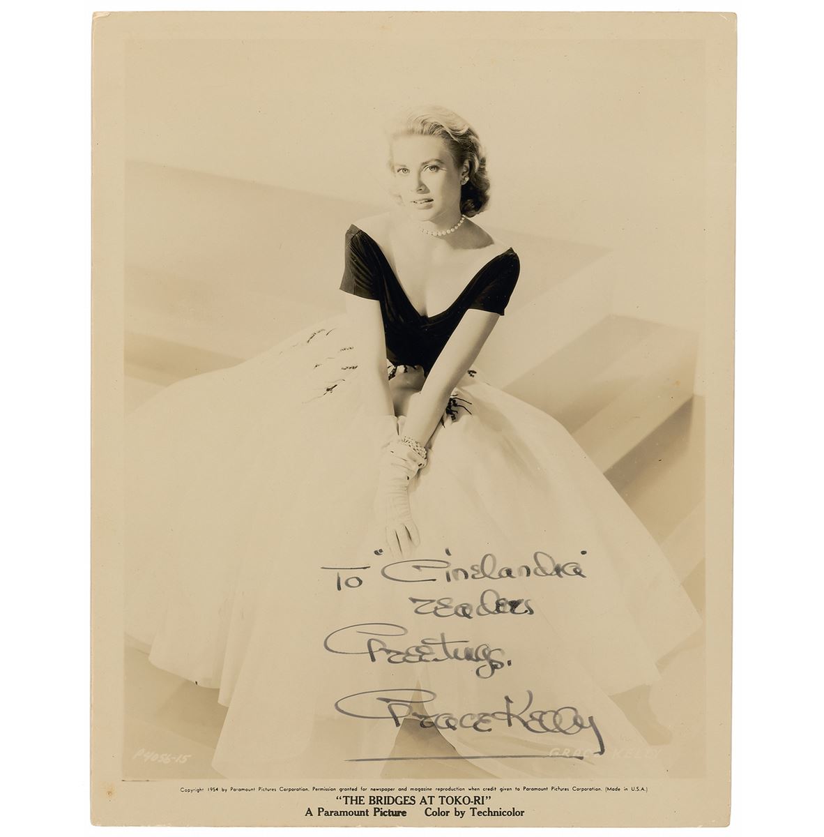 Beautiful vintage glossy 8 x 10 Paramount publicity portrait of Kelly for the 1954 film The Bridges at Toko-Ri, boldly signed and inscribed in fountain pen, “To ‘Cinelandia’ readers, Greetings, Grace Kelly.” In fine condition, with slight corner creasing and scattered surface impressions. Inspired by US publications like Photoplay and Moving Picture World, and carrying the torch lit by the popular Cinearte, the Brazilian magazine Cinelandia showcased the latest stars and films from Latin America and Hollywood. Running from 1952 to 1964, Cinelandia’s content of reviews, film stills, publicity shots, and gossip columns played an integral role in disseminating feminine beauty, modernity, and screen icon fashion.