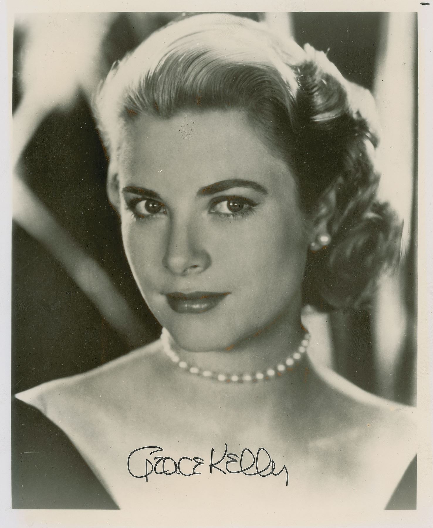 Beautiful glossy 8 x 10 close-up photo of Kelly wearing pearls, boldly signed in black felt tip. In fine condition, with light silvering outlining her face and features.