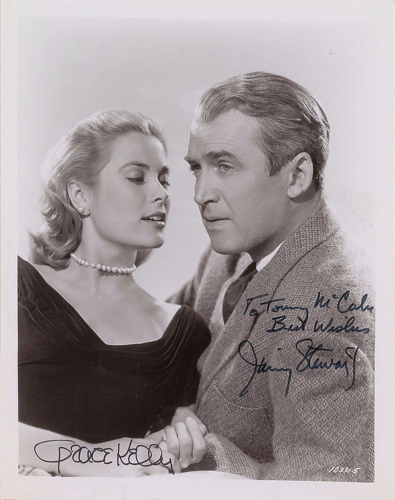 Appealing glossy 8 x 10 photo of Kelly and Stewart as they appeared in Alfred Hitchcock's 1954 classic Rear Window, signed and inscribed in black felt tip, "Grace Kelly" and "To Tommy McColn, Best Wishes, Jimmy Stewart.” In fine condition, with a crease and small tear to the blank lower border.