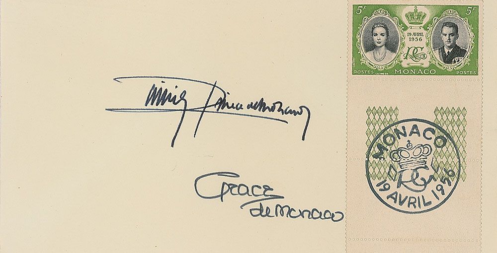 Postal cover bearing a cancellation of April 19, 1956, the date of the couple’s wedding, signed in black ink, “Grace de Monaco,” and “Rainier, Prince de Monaco.” In fine condition. Accompanied by the original mailing envelope.