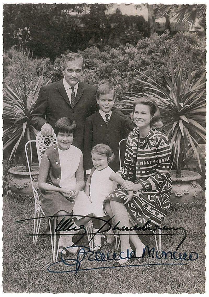 Vintage 4 x 6 deckle-edge postcard photo of Grace, Rainier and their three children, signed in blue ink, “Grace de Monaco,” and signed in black ink by Rainier. In fine condition. Accompanied by a 1968 TLS from Rainier’s secretary acknowledging the photo, as well as the original mailing envelope.
